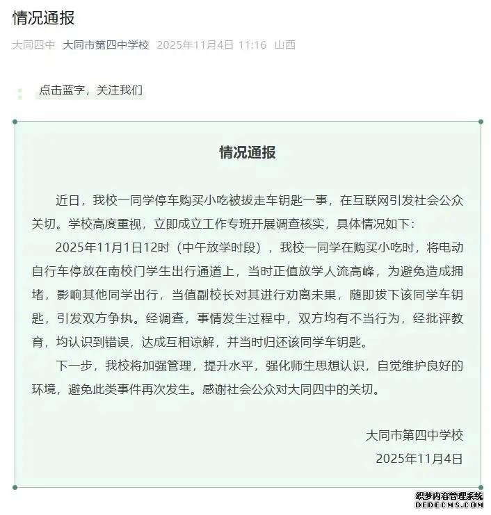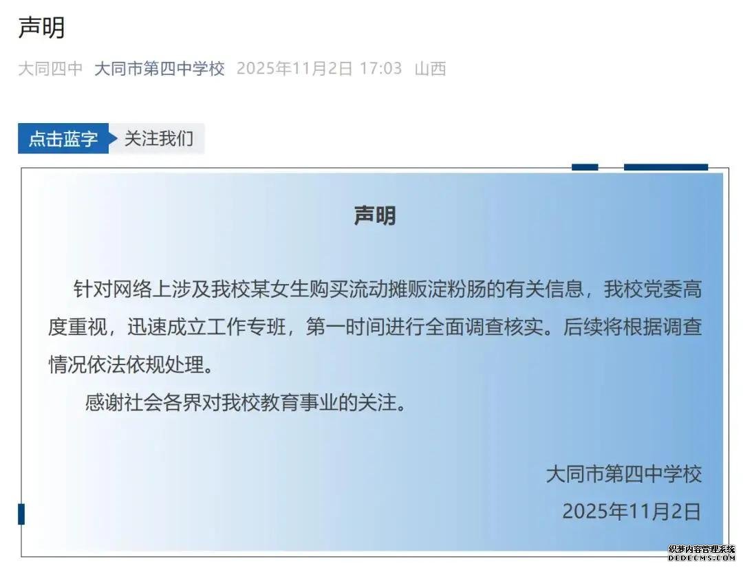 11月2日,大同市第四中学哔咔漫画校发布声明:
